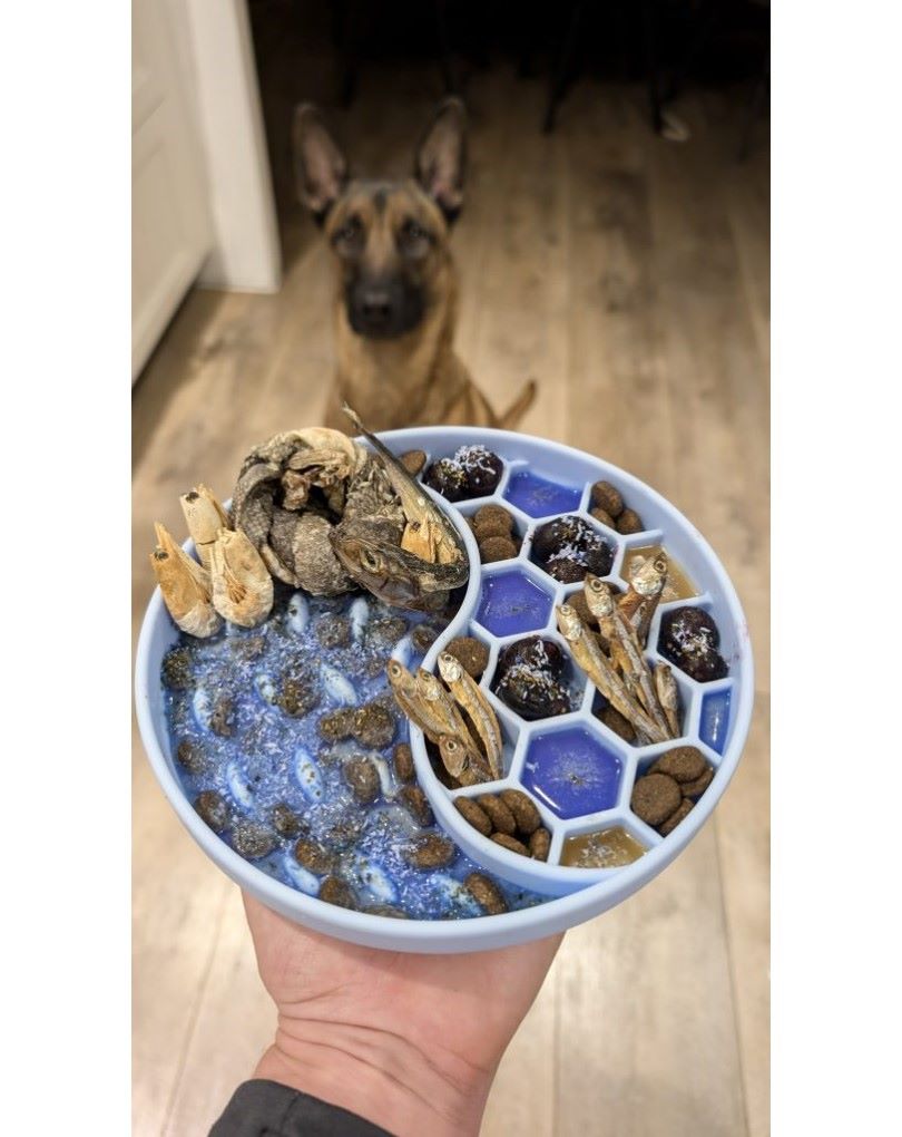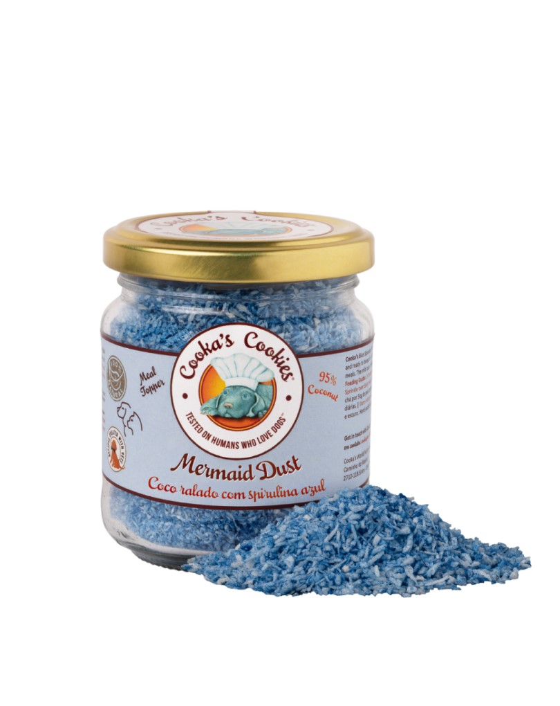 Mermaid Dust from Cooka’s Cookies is crafted from 100% human-grade ingredients, primarily coconut and blue spirulina. It is designed as an easy meal booster: you can sprinkle it over the regular food or mix with a little water into a paste. It supports digestion, gut health, immunity and a healthy skin & shiny coat. It is gluten-free and grain-free.