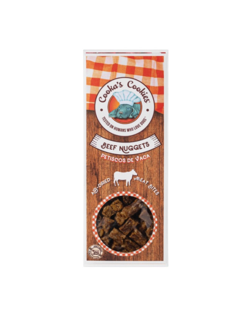 The Beef Nuggets by Cooka’s Cookies are crafted from 70% muscle meat (beef) and 30% beef bones. They are air-dried to retain flavor and nutrients, and each pack contains 60 g of treat.