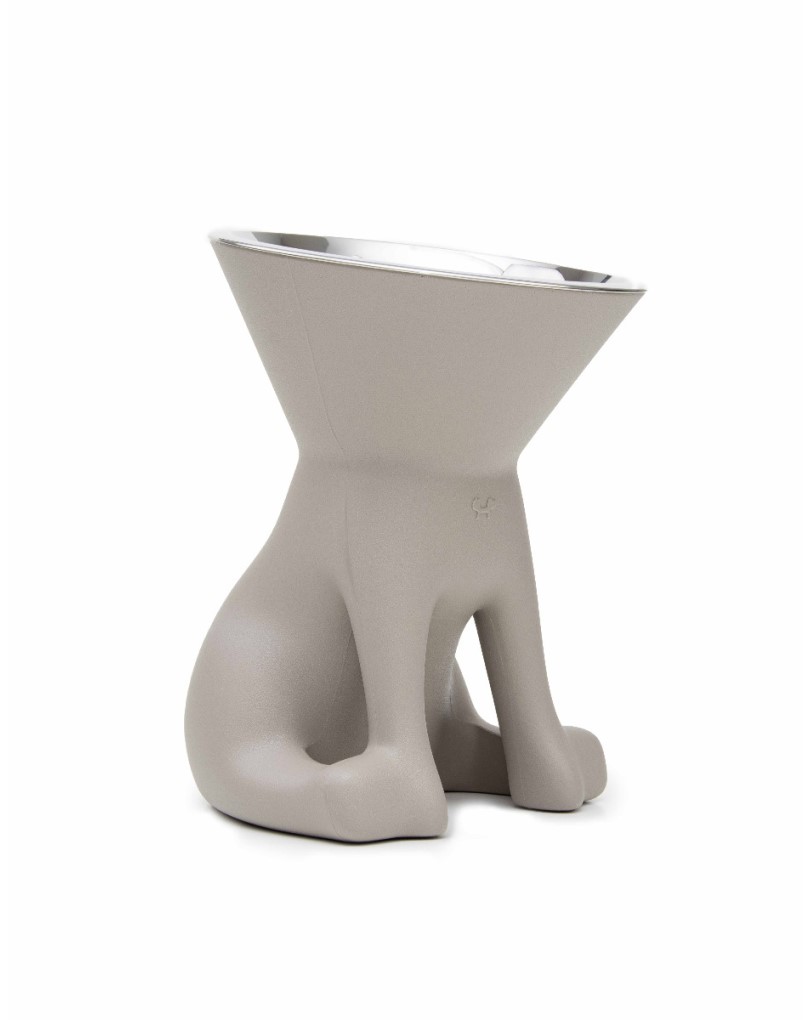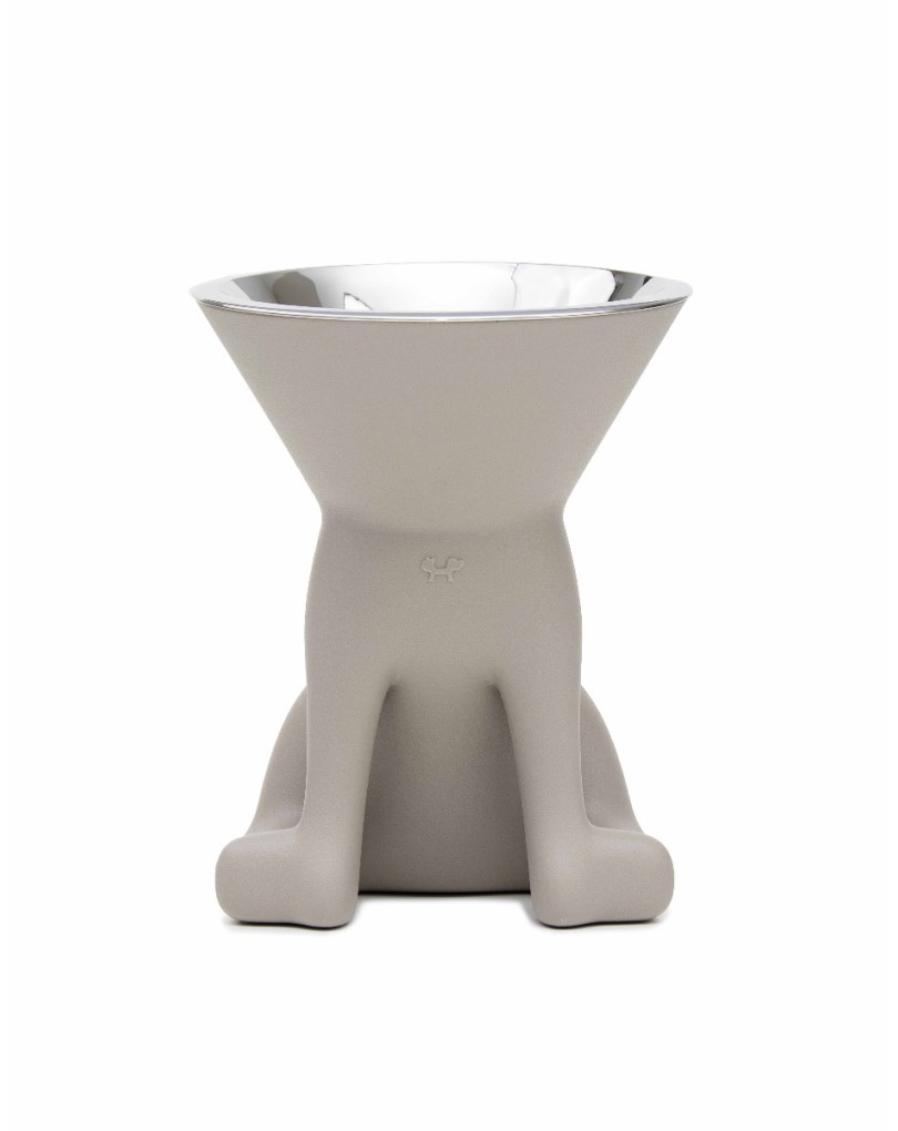 The Elizabeth bowl features a playful design inspired by the Elizabethan collar. Its conical shape serves as a stable base, elevating the stainless steel bowl to a comfortable height for medium to large dogs. Made from high-density polyethylene, the base is sturdy and non-toxic. The removable stainless steel bowl has a capacity of 1100 ml and is dishwasher-safe. Available in dove grey, yellow, and black.