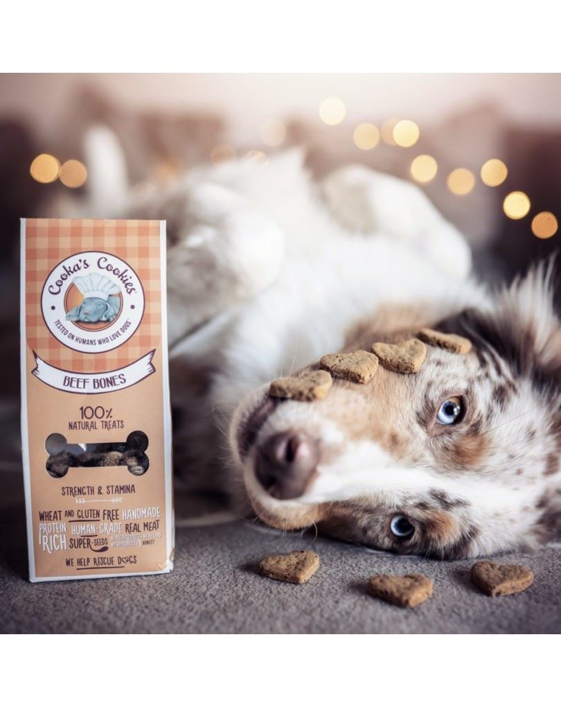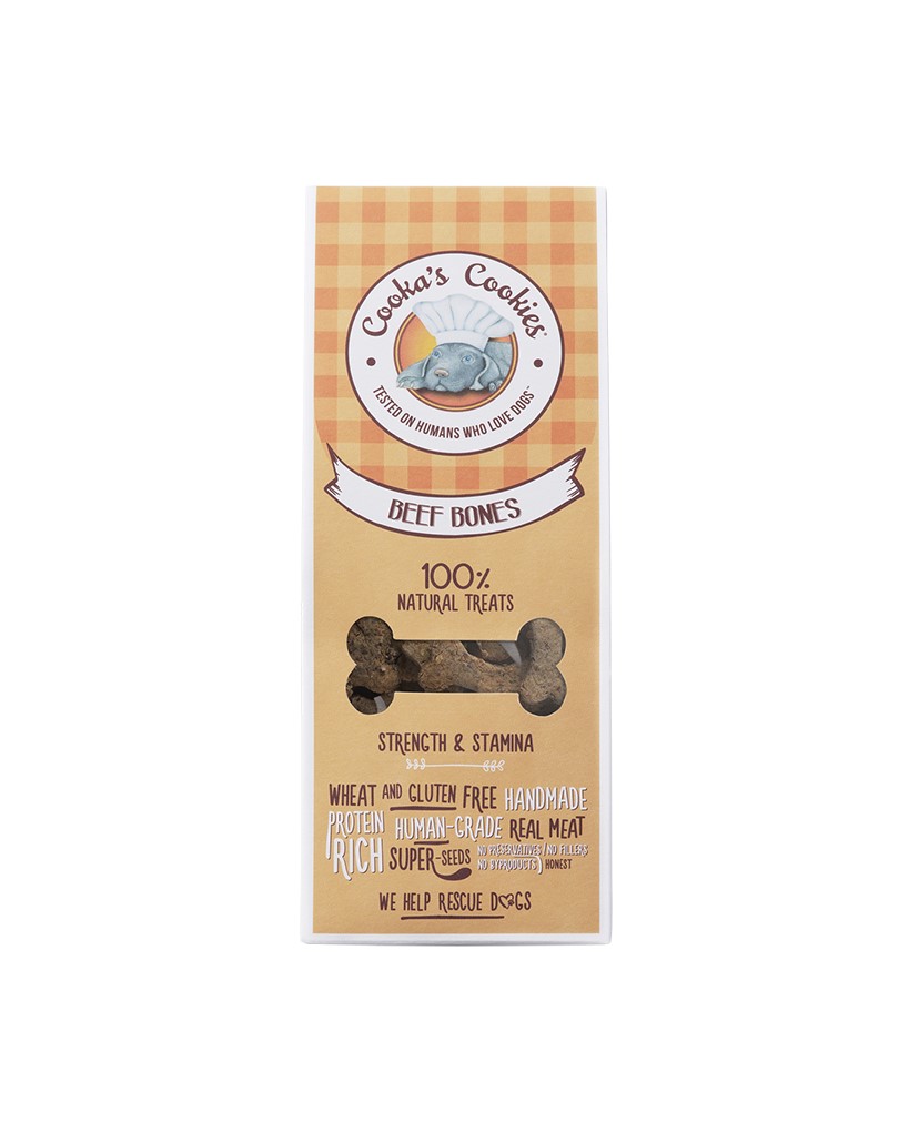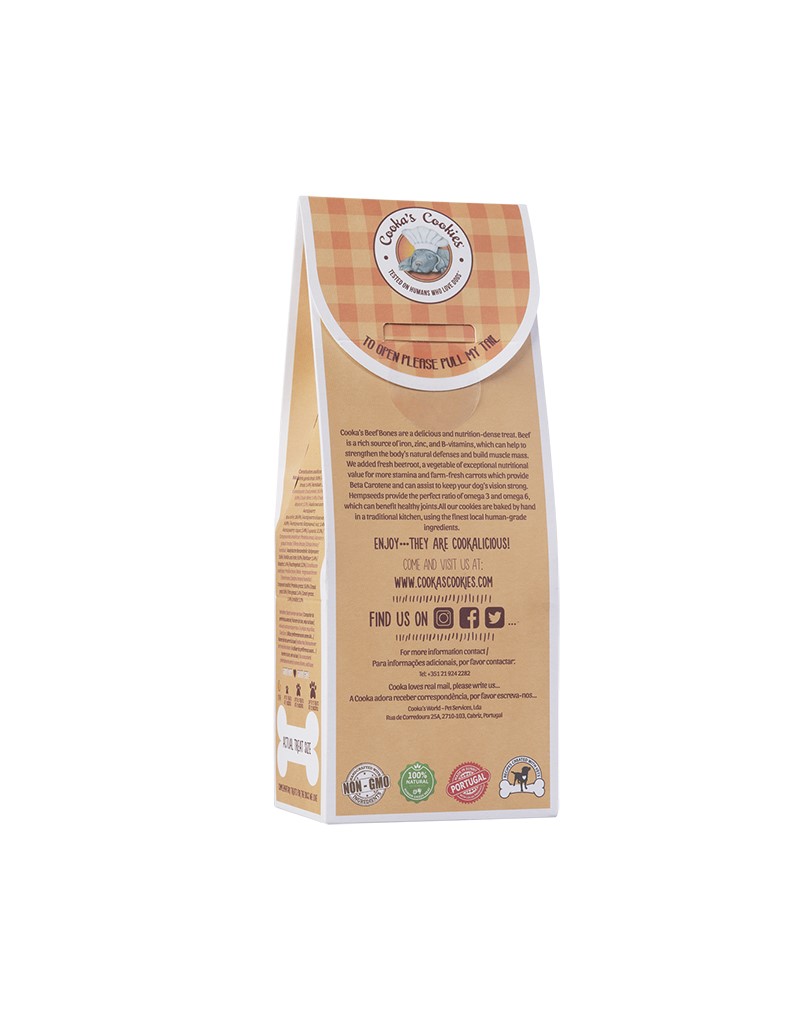 - Cooka’s Beef Bones are hearty, oven-baked dog biscuits crafted from 30% fresh beef (muscle, liver, and kidney) blended with carrots, beetroot, and wholesome seeds. Naturally rich in protein, iron, and essential fatty acids, these biscuits help support muscle strength and overall vitality. Flavored with natural pork fat and herbs like parsley and rosemary, they offer a mouthwatering aroma dogs can’t resist. 100% natural — no artificial colors, preservatives, or additives.