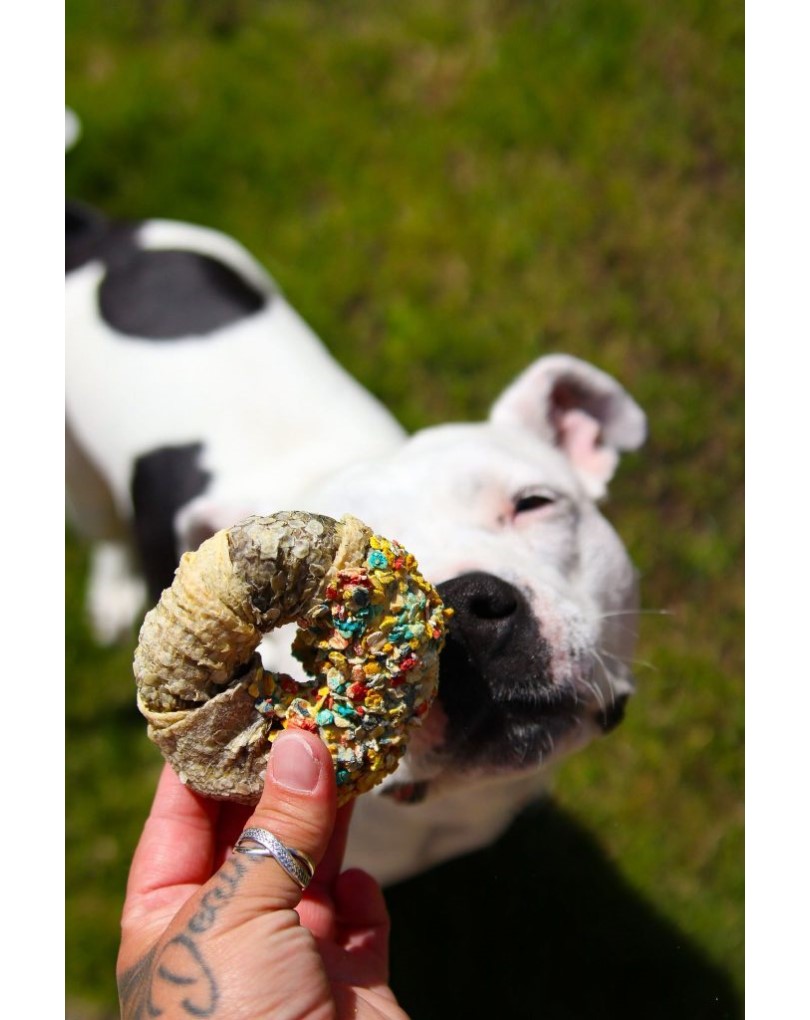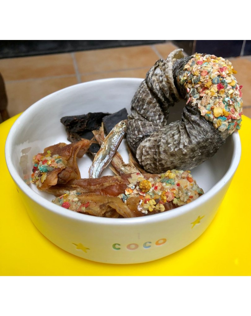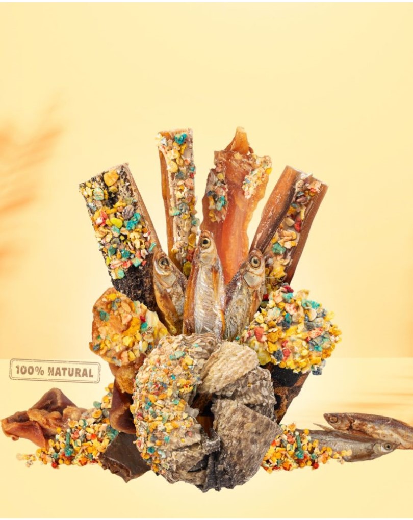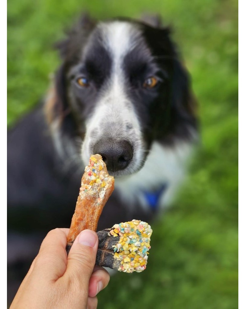 - Each piece is 100% natural: meat or fish is the main ingredient, then lightly dusted with “dogfetti” (superfood oats). There are no added refined sugars, no artificial colourings or fillers. It’s crafted to give chewing satisfaction, high protein value, and healthy snack time for dogs.