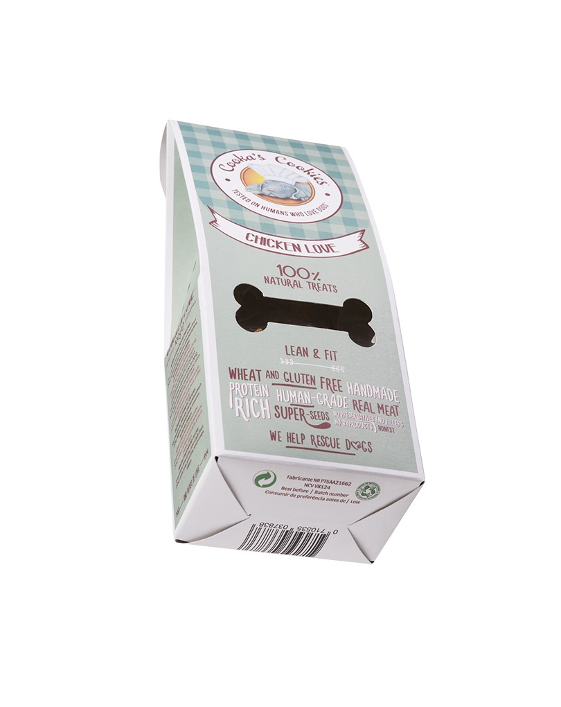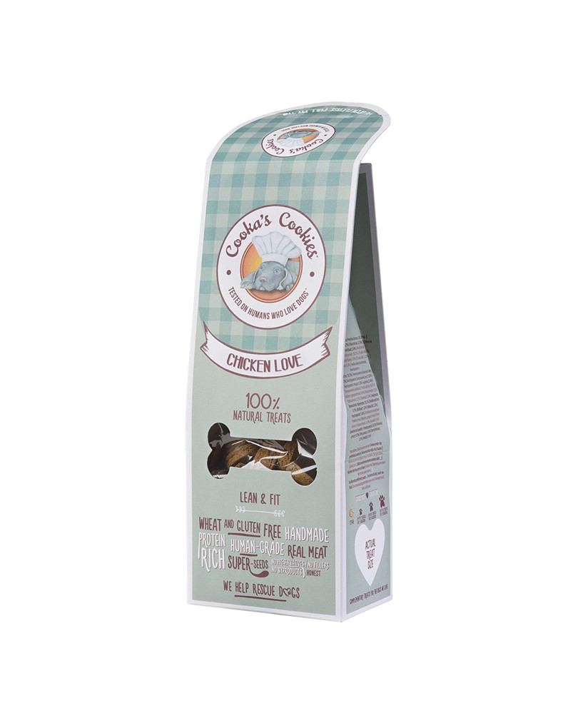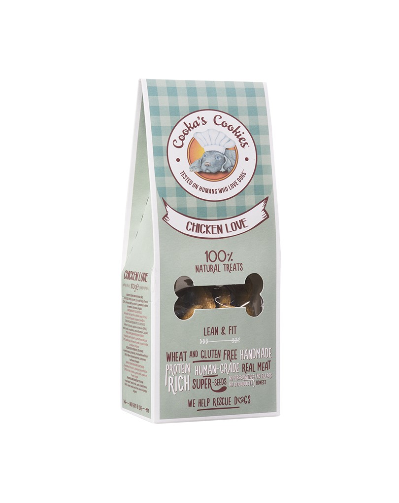 - Cooka’s Chicken Love biscuits are lovingly oven-baked with fresh chicken breast and whole oats for a nutritious, flavorful crunch. High in natural protein and gently baked to preserve nutrients, they make an ideal reward or wholesome snack. Free from wheat, artificial flavors, and preservatives.