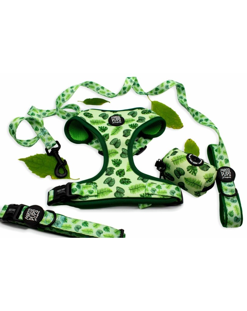 Products details: Original Messi Pups design, ‘Leaf Me Alone’. A fun, tropical, leafy pattern in various shades of green, transports you and your pooch right into the heart of the jungle!