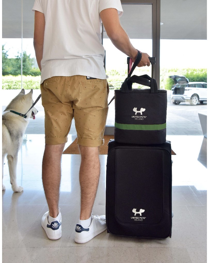 - The Pet Travel Bag is made from 100% recycled PET fabric, offering a sustainable solution for transporting your pet's essentials. It features a convenient rear strap to attach to a trolley, making travel more convenient.
