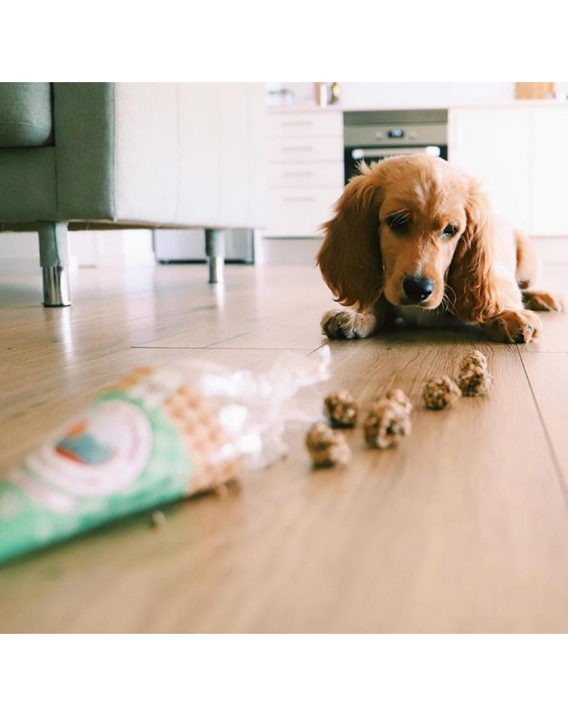 - Composition: Fresh pork meat (40 %) (muscle, kidney, liver) + sardines (10 %) + oats + carrots + flaxseed (linseed) + rosemary extract.