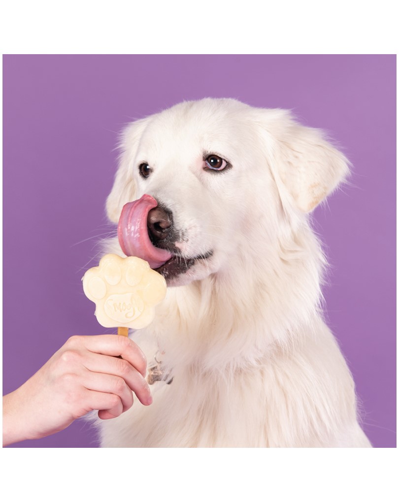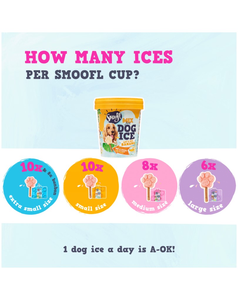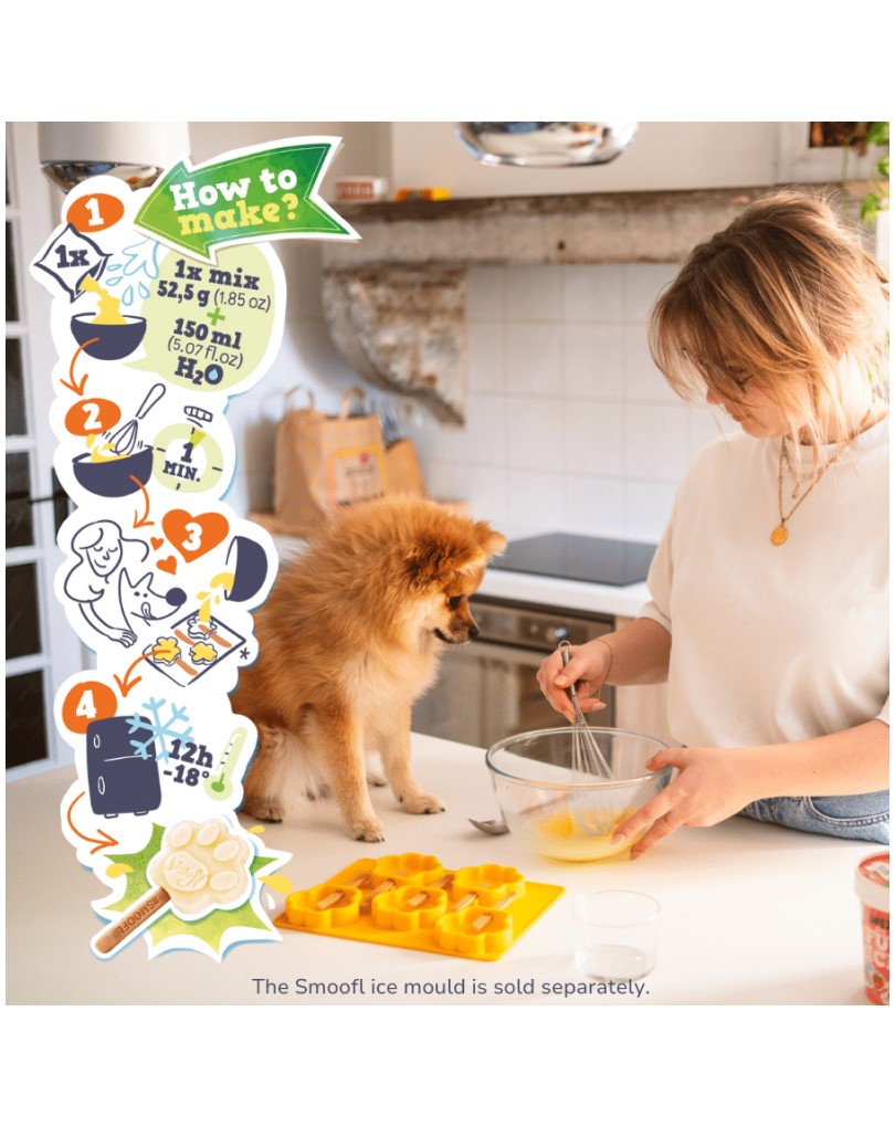 - “Spoil your furriend with our Smoofl Mix for Dog Ice in the flavour Banana. The mix comes with 10 edible sticks … Ready in just 60 seconds … The Ice Treats are 100% tailored to your pawesome friend and are lactose-, grain- and fat free so every dog can Smoofl with gusto.”