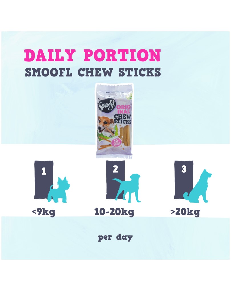 The Smoofl Chew Sticks are 100% made to suit your four-legged friend and are lactose-, grain- and fat-free so that every dog can enjoy Smoofl .