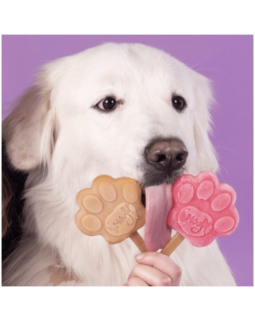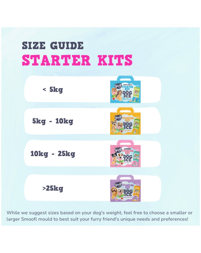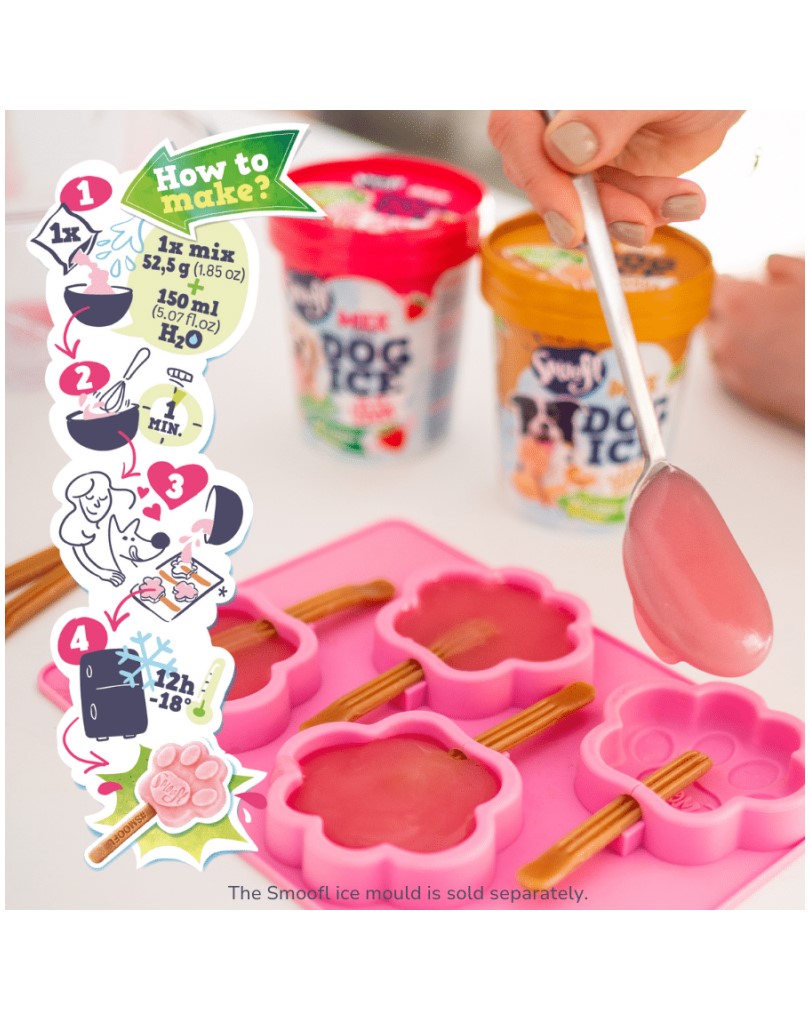 - The Starter Kit for Dog Ice has everything you need for a pawtastic moment of quality time with your dog! The kit includes the Strawberry and Peanut Butter Mix for Dog Ice, edible Chew Sticks and the Medium mould. You make no less than 16 of your sweetheart’s favourite Smooflicious ice creams… Ready, set, Smoofl!”