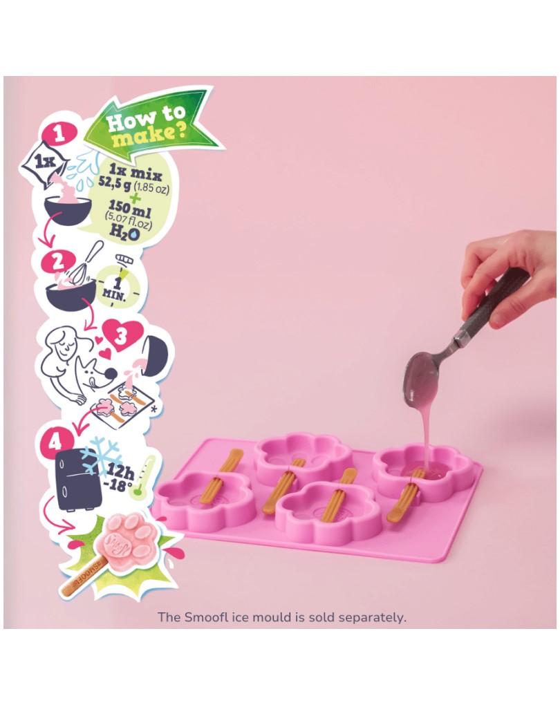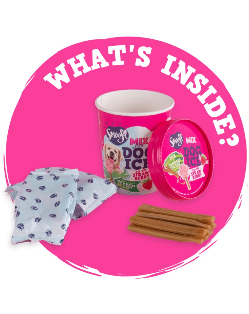 - “Spoil your furriend with our Smoofl Mix for Dog Ice in the flavour Strawberry. The mix comes with 10 edible sticks … Ready in just 60 seconds … The Ice Treats are 100% tailored to your pawesome friend and are lactose-, grain- and fat free so every dog can Smoofl with gusto.”