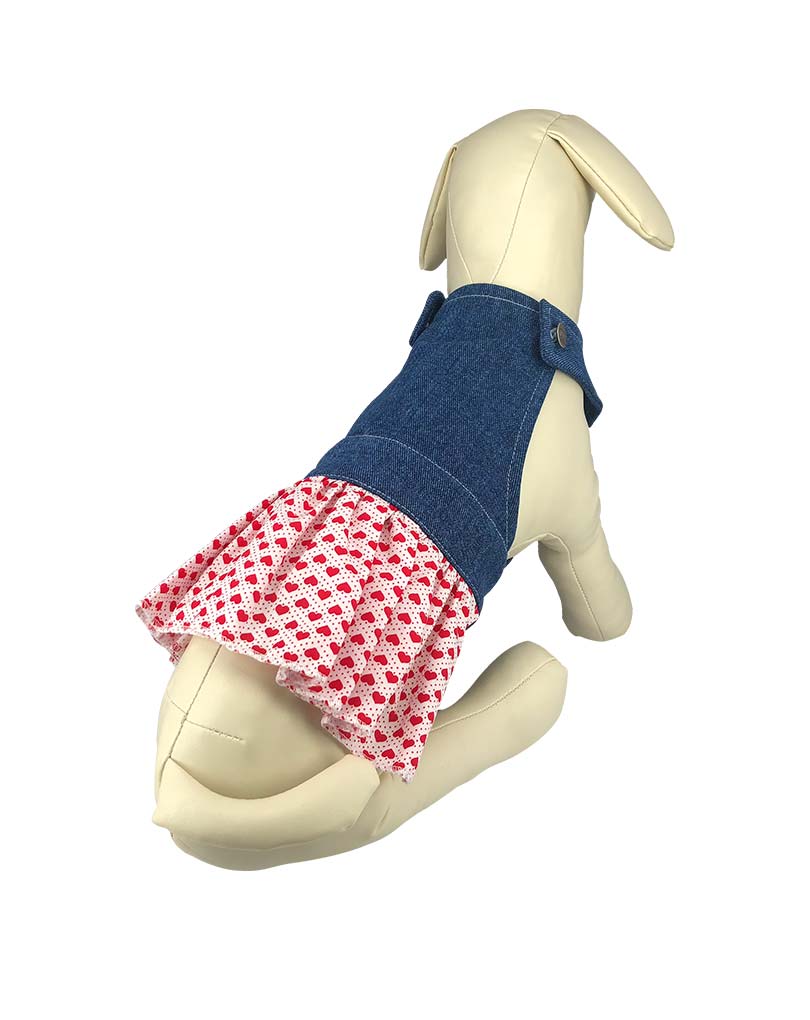 "The Valentine Red Hearts Print" Blue Denim Pleated Salopette Dress