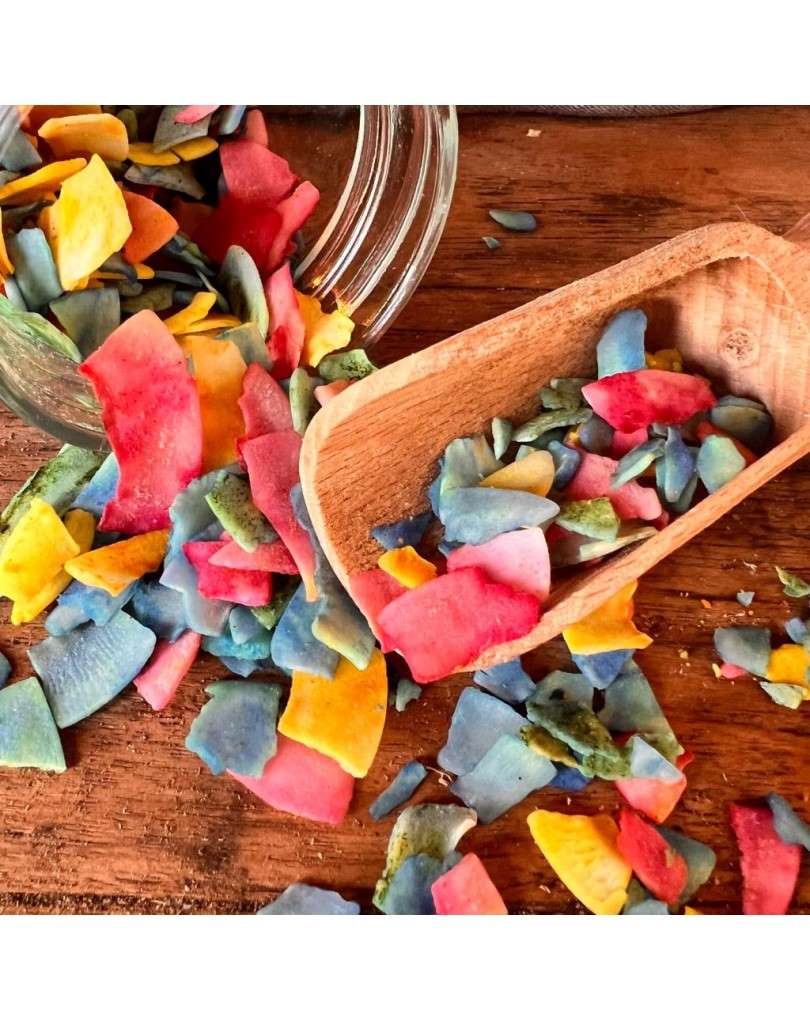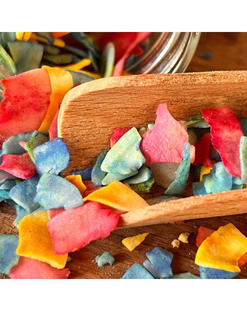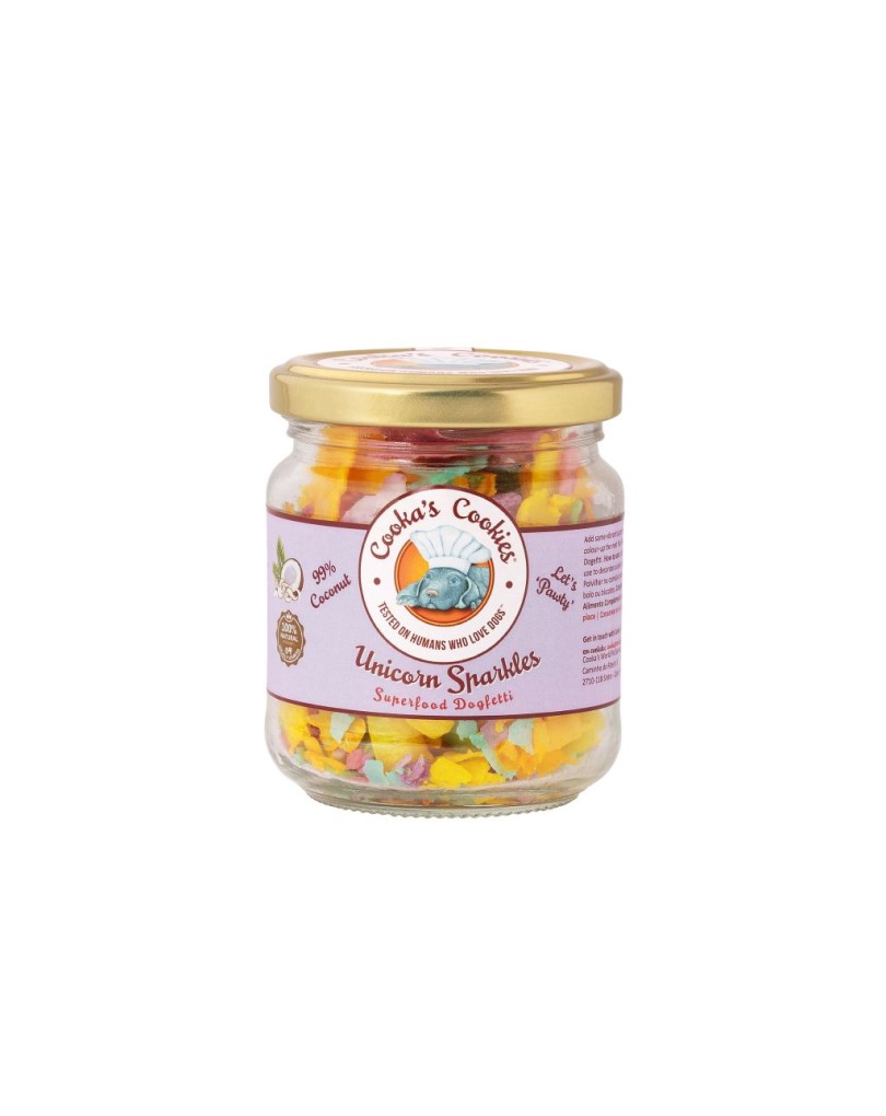 - Unicorn Sparkles (also marketed alongside “Rainbow Dogfetti”) from Cooka’s Cookies are a magical meal topper made from coconut flakes, rosemary extract and superfood powders (green & blue spirulina, turmeric, beetroot). Intended for dogs’ meals (BARF, kibble, treats) and especially for special occasions like dog birthdays. The coconut base provides healthy fats, and the superfood powders add antioxidant, skin/coat and digestive support.